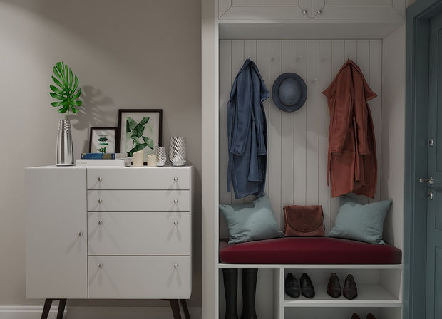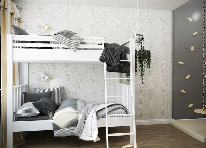 В детской комнате заказчики просили выделить побольше места для игр, поэтому было решено поставить двухъярусную кровать, чтобы съэкономить свободное пространство. Цвета выбрали спокойные, природных оттенков: зеленый, серый, белый, дерево. Для одежды мы предусмотрели большой встроенный шкаф с тремя секциями. Для игрушек - шкаф с распашными створками и ящиками из IKEA. При входе в комнату расположили банкетку для школьных портфелей. Там же на крючки можно повесить рюкзаки и одежду.
