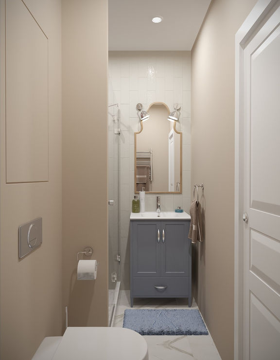 В гостевом санузле поместилась просторная душевая. В соседнем помещении на месте бывшего коридора удалось организовать полноценную постирочную со стиральной и сушильной машинами и полочками для хранения бытовых принадлежностей.
